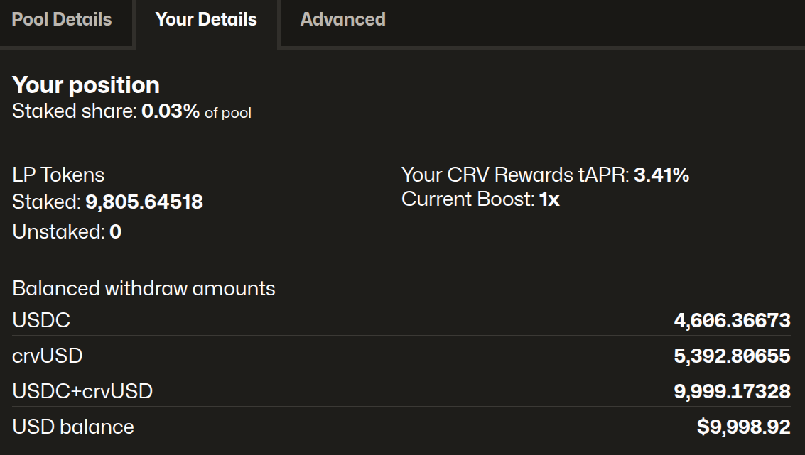 USDCandcrvUSD: We own a share of assets in the pool, so that means we have 4,606USDCand 5,392crvUSD. As users swap in this pool, these numbers will change, and the total should increase because of earned swap fees, becoming worth more than $10k in time. - Earning 3.41%